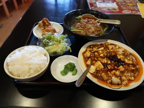 謎系中華のお店に再訪しました。 店内 めにゅー 日替わり定食 麻婆豆腐(辛く)+唐揚げ+台湾ラーメン 奥さん! 税抜き650円ですよ! ※ご飯お替りOK 八角の効いた挽肉が乗ってます 細麺若干縮れ 辛くしてくださいと言ったら、唐辛子の真っ黒こげが乗って…